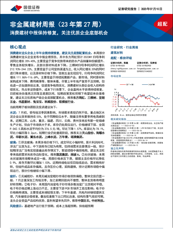 【国信证券】【20230710】非金属建材周报(23年第27周):消费建材中报保持修复,关注优质企业底部机会-23页