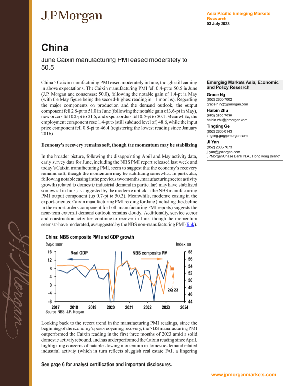 【J.P. Morgan】【20230703】June Caixin manufacturing PMI eased moderately to 50.5-10页