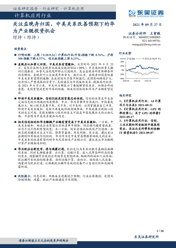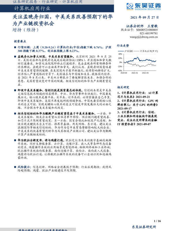 【东吴证券】【20210927】计算机应用行业:关注孟晚舟归国,中美关系改善预期下的华为产业链投资机会-16页