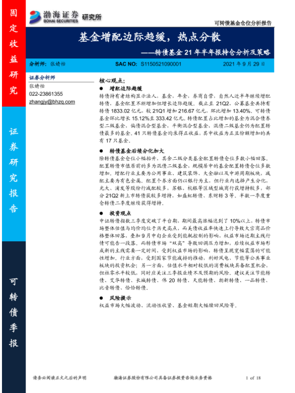 【渤海证券】【20210929】转债基金21年半年报持仓分析及策略:基金增配边际趋缓,热点分散-18页