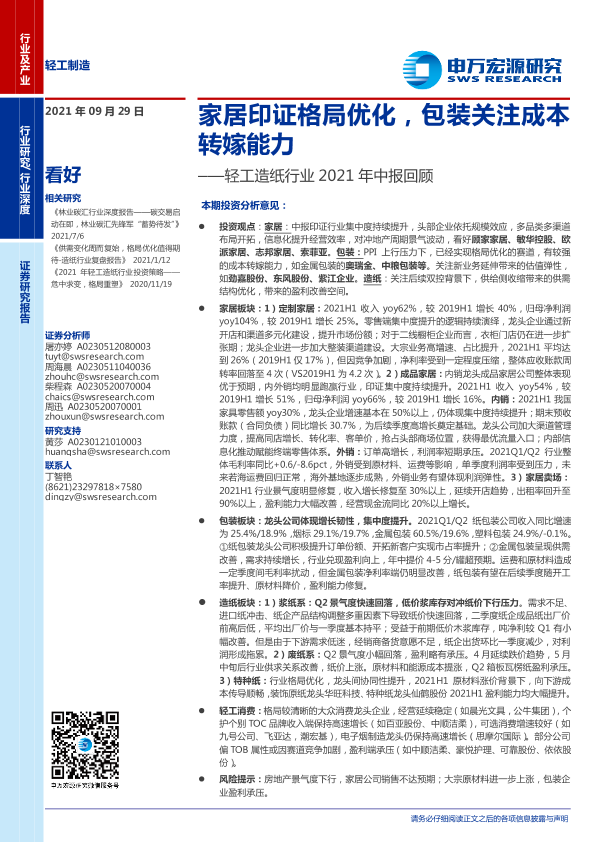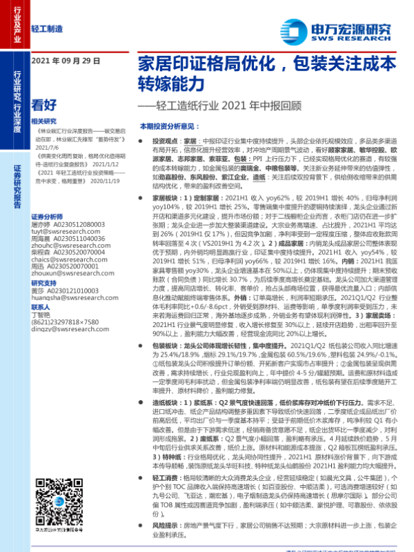 【申万宏源】【20210929】轻工造纸行业2021年中报回顾:家居印证格局优化,包装关注成本转嫁能力-35页