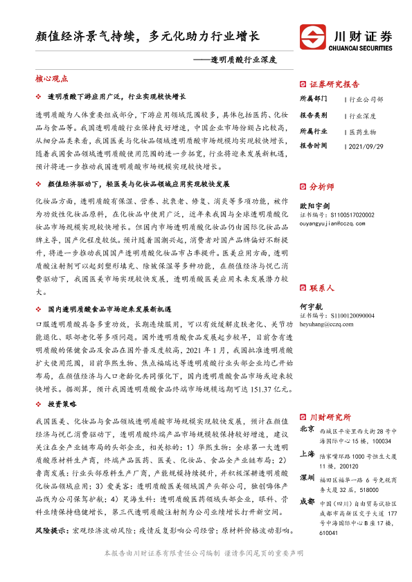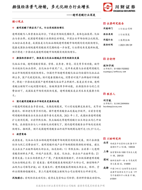 【川财证券】【20210929】透明质酸行业深度:颜值经济景气持续,多元化助力行业增长-32页
