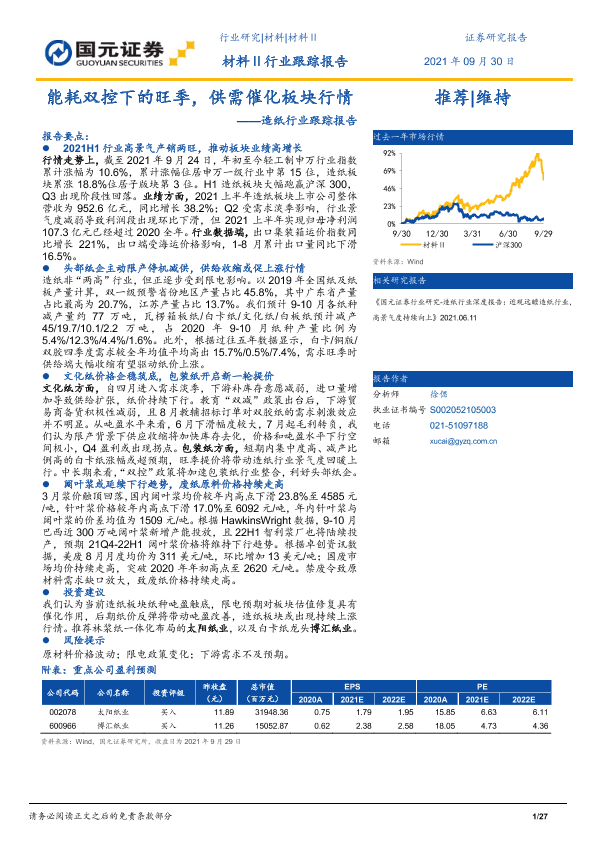 【国元证券】【20210930】能耗双控下的旺季,供需催化板块行情——造纸行业跟踪报告-27页