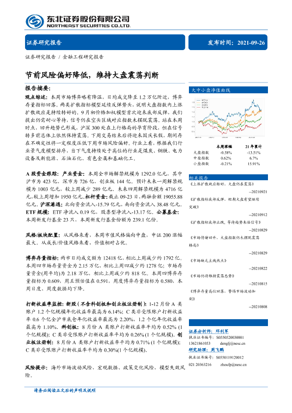 【东北证券】【20210926】金融工程研究报告:节前风险偏好降低,维持大盘震荡判断-30页