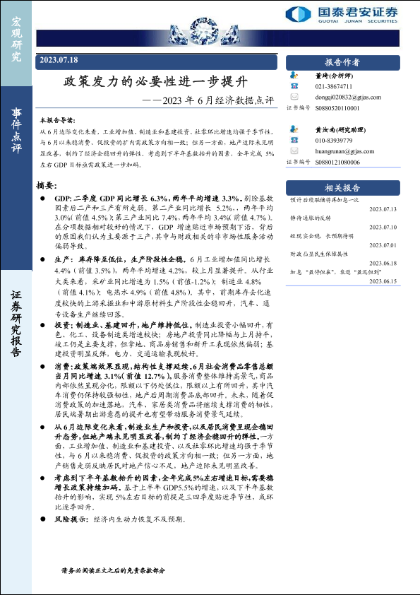 【国泰君安证券】【20230718】2023年6月经济数据点评:政策发力的必要性进一步提升-15页