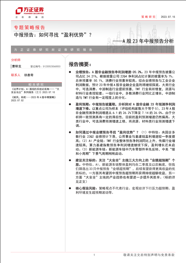 【方正证券】【20230715】A股23年中报预告分析:中报预告,如何寻找“盈利优势”-16页
