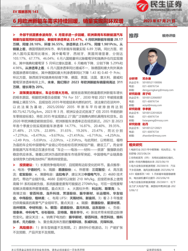 【民生证券】【20230721】EV观察系列143:6月欧洲新能车需求持续回暖,销量实现同环双增-21页