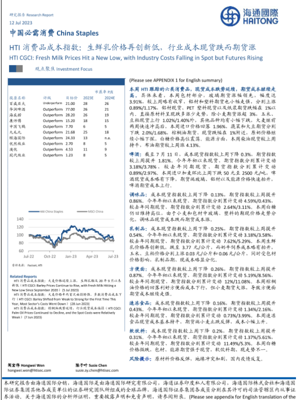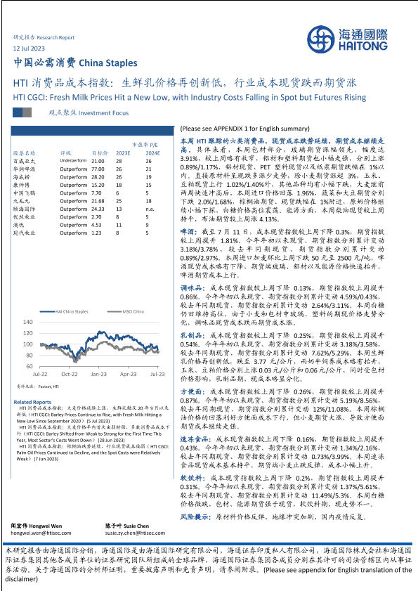 【海通国际】【20230718】HTI消费品成本指数:生鲜乳价格再创新低,行业成本现货跌而期货涨-17页