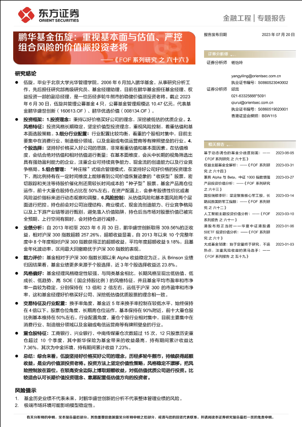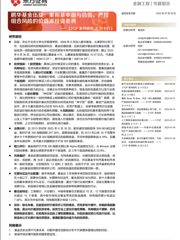 【东方证券】【20230720】《FOF系列研究之六十六》:鹏华基金伍旋,重视基本面与估值、严控组合风险的价值派投资老将-15页