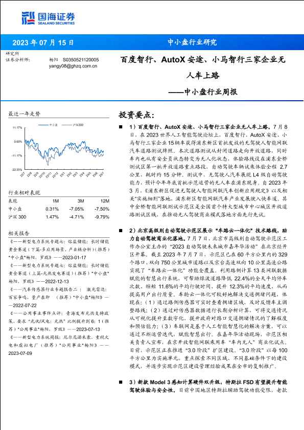 【国海证券】【20230715】中小盘行业周报:百度智行、AutoX安途、小马智行三家企业无人车上路-22页