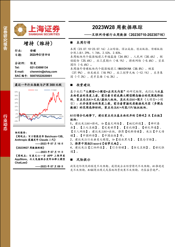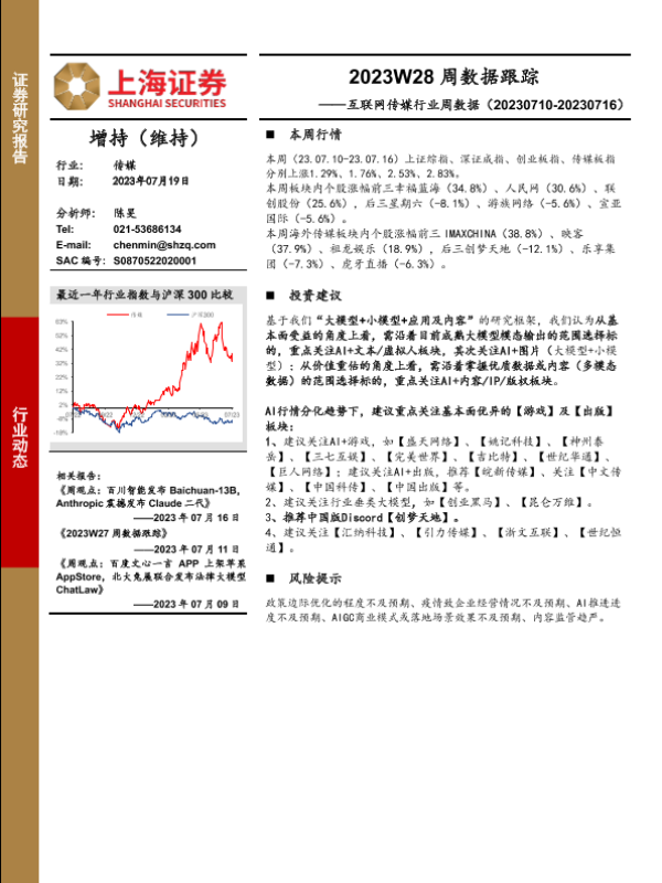【上海证券】【20230719】互联网传媒行业周数据:2023W28周数据跟踪-20页