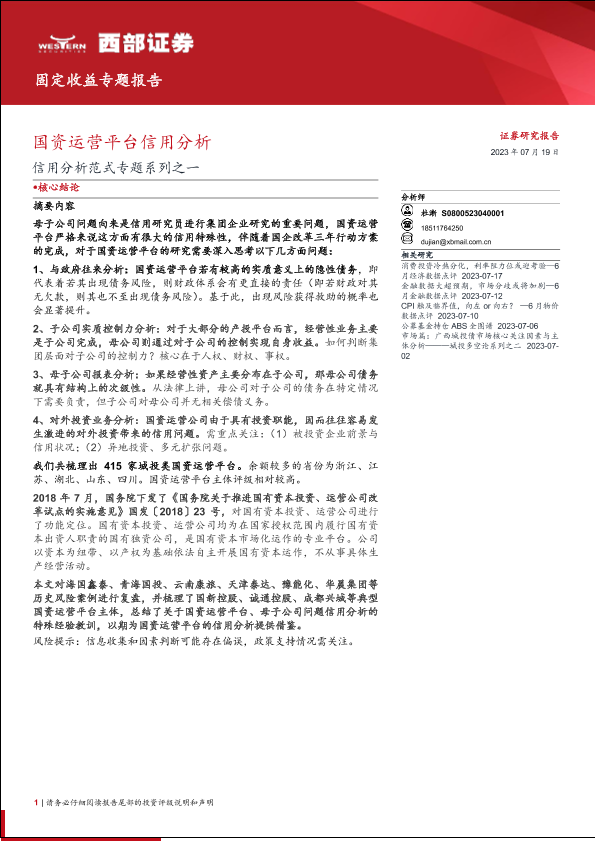 信用分析 债务风险 国企改革 投资评级 国资运营平台