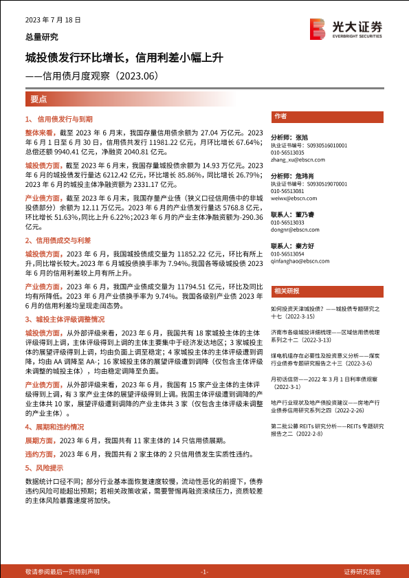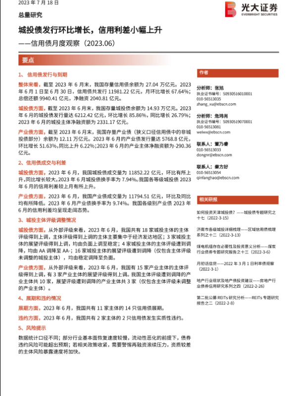 【光大证券】【20230718】信用债月度观察:城投债发行环比增长,信用利差小幅上升-18页