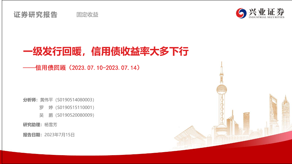【兴业证券】【20230715】信用债回顾:一级发行回暖,信用债收益率大多下行-37页