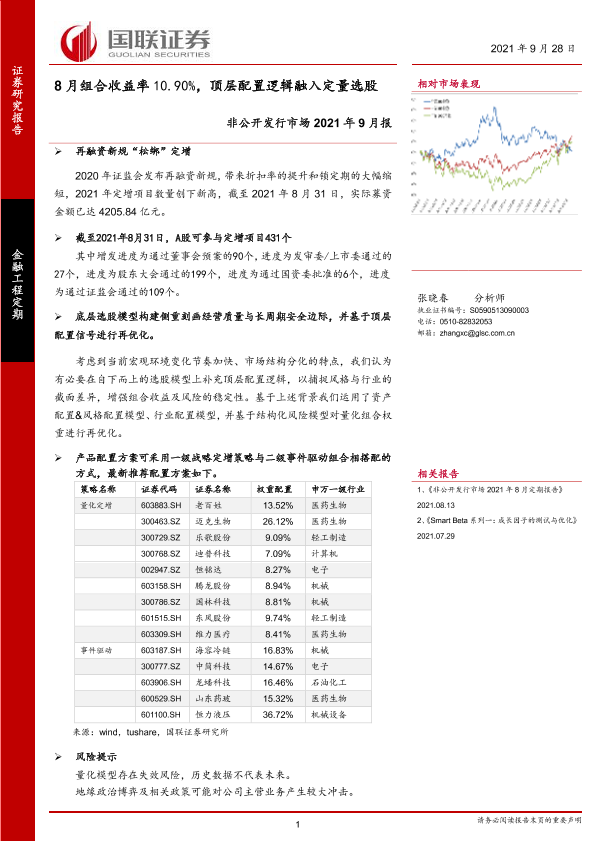【国联证券】【20210928】非公开发行市场2021年9月报:8月组合收益率10.90%,顶层配置逻辑融入定量选股-29页