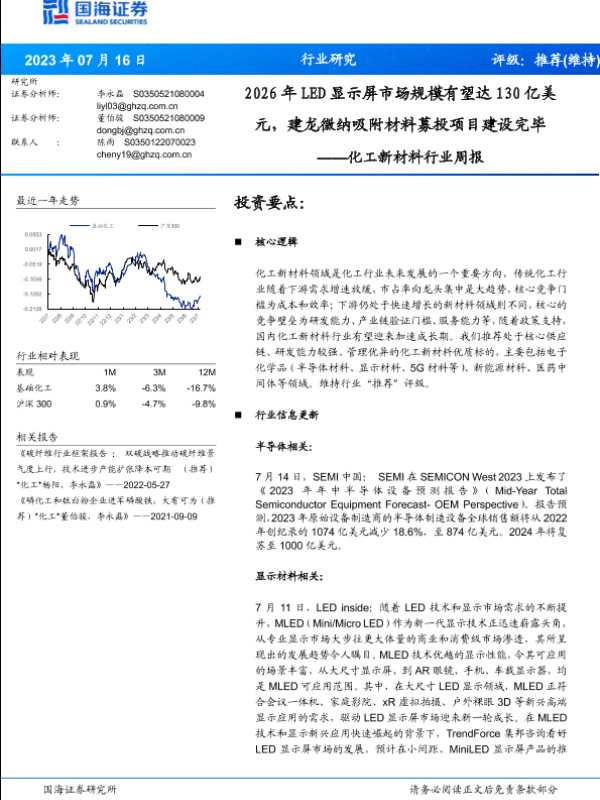 【国海证券】【20230716】化工新材料行业周报:2026年LED显示屏市场规模有望达130亿美元,建龙微纳吸附材料募投项目建设完毕-33页