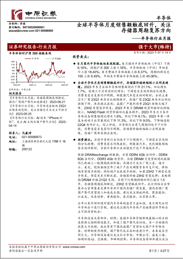 【中原证券】【20230714】半导体行业月报:全球半导体月度销售额触底回升,关注存储器周期复苏方向-27页