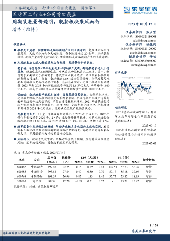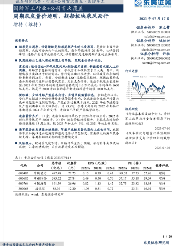【东吴证券】【20230717】国防军工行业+公司首次覆盖:周期筑底量价趋明,舰船板块乘风而行-29页