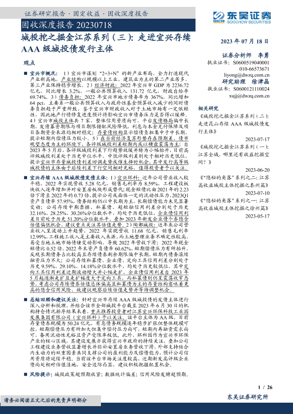 【东吴证券】【20230718】城投挖之掘金江苏系列(三):走进宜兴存续AAA级城投债发行主体-26页