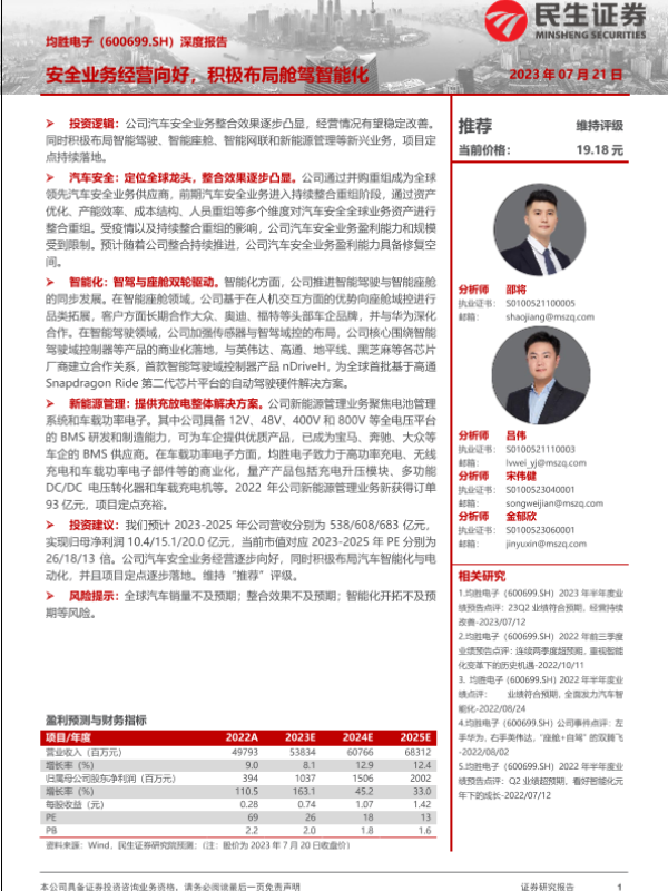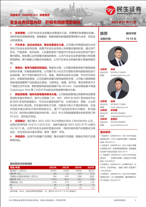 【民生证券】【20230721】均胜电子(600699)深度报告:安全业务经营向好,积极布局舱驾智能化-27页