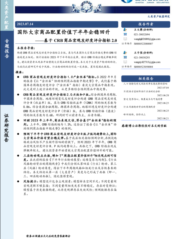 【国泰君安证券】【20230714】基于CRB商品宏观友好度评分指标2.0:国际大宗商品配置价值下半年企稳回升-22页