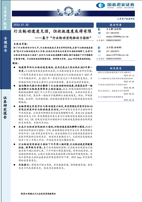 【国泰君安证券】【20230720】基于“行业轮动宏观驱动力指标”:行业轮动速度见顶,但收敛速度或将有限-15页