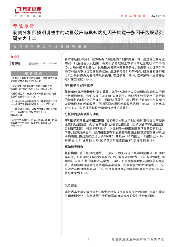 【方正证券】【20230718】多因子选股系列研究之十二:剥离分析师预期调整中的动量效应与真知灼见因子构建-20页