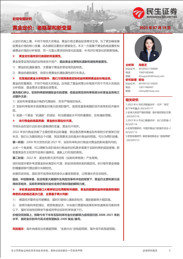 【民生证券】【20230718】宏观专题研究:黄金定价,老框架和新变量-17页