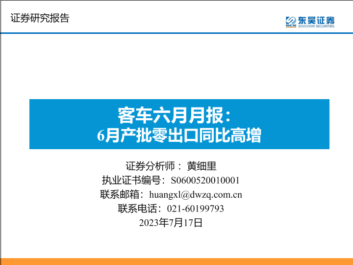 【东吴证券】【20230717】客车六月月报:6月产批零出口同比高增-16页