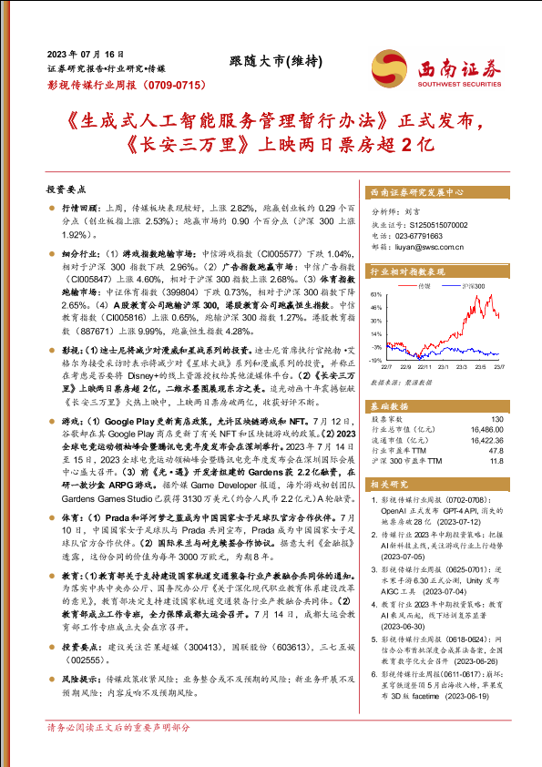 【西南证券】【20230716】影视传媒行业周报:《生成式人工智能服务管理暂行办法》正式发布,《长安三万里》上映两日票房超2亿-21页