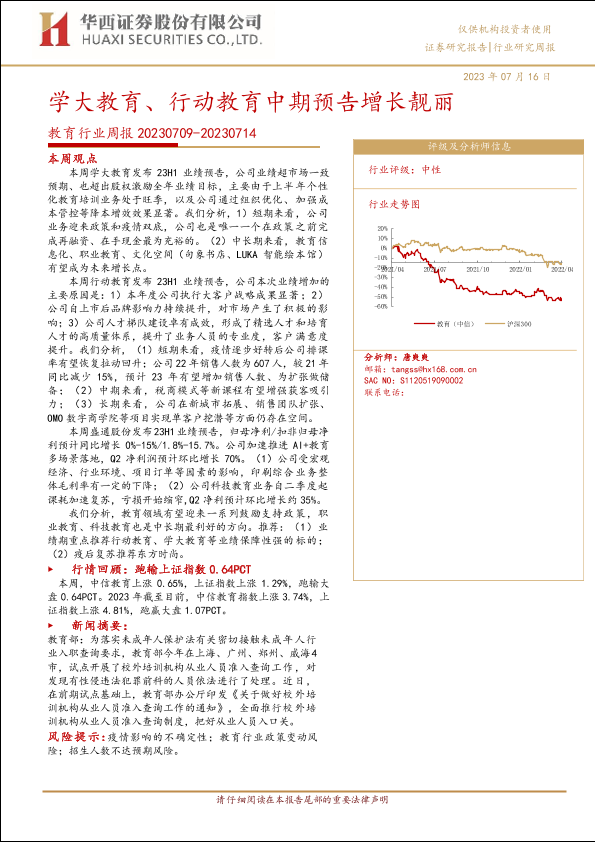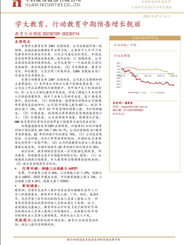 【华西证券】【20230716】教育行业周报:学大教育、行动教育中期预告增长靓丽-16页