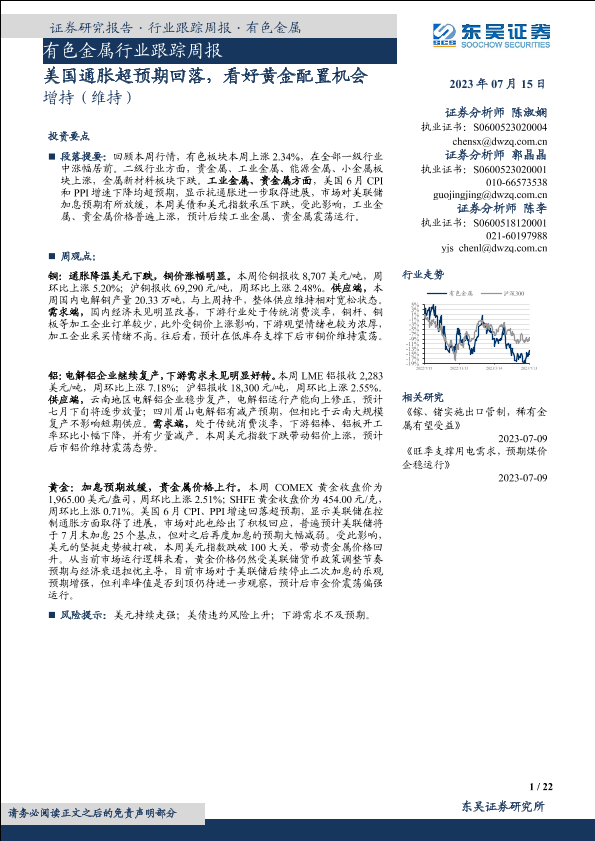 【东吴证券】【20230715】有色金属行业跟踪周报:美国通胀超预期回落,看好黄金配置机会-22页
