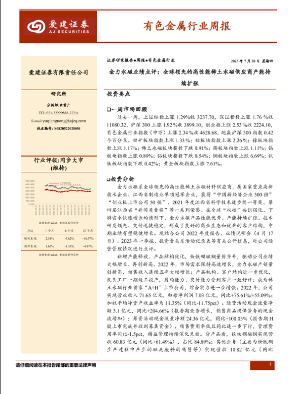 【爱建证券】【20230720】有色金属行业周报:金力永磁业绩点评:全球领先的高性能稀土永磁供应商产能持续扩张-44页