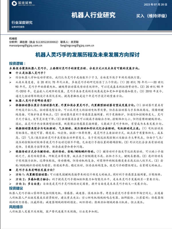 【国金证券】【20230720】机器人行业深度研究:机器人灵巧手的发展历程及未来发展方向探讨-20页