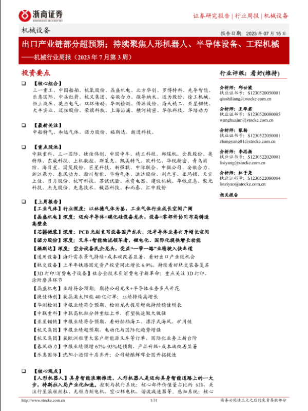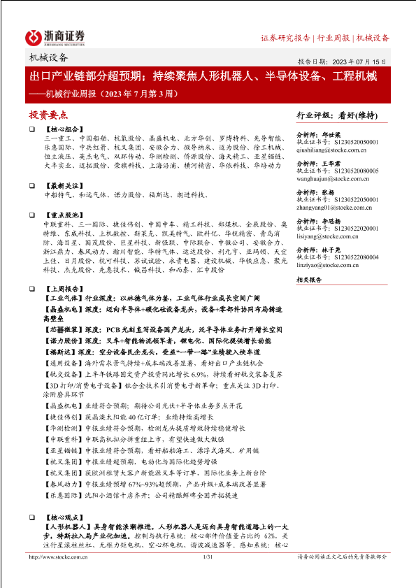 【浙商证券】【20230715】机械行业周报(2023年7月第3周):出口产业链部分超预期;持续聚焦人形机器人、半导体设备、工程机械-31页