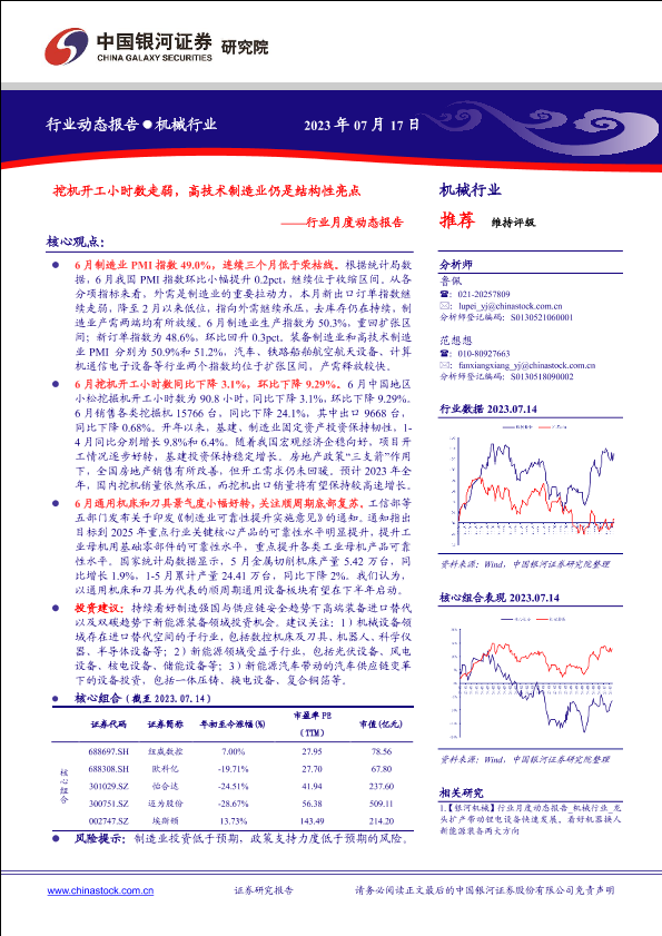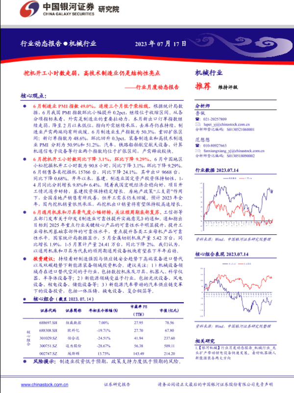【银河证券】【20230717】机械行业月度动态报告:挖机开工小时数走弱,高技术制造业仍是结构性亮点-30页