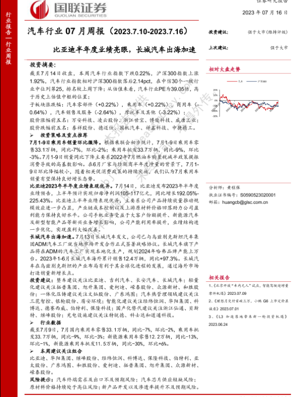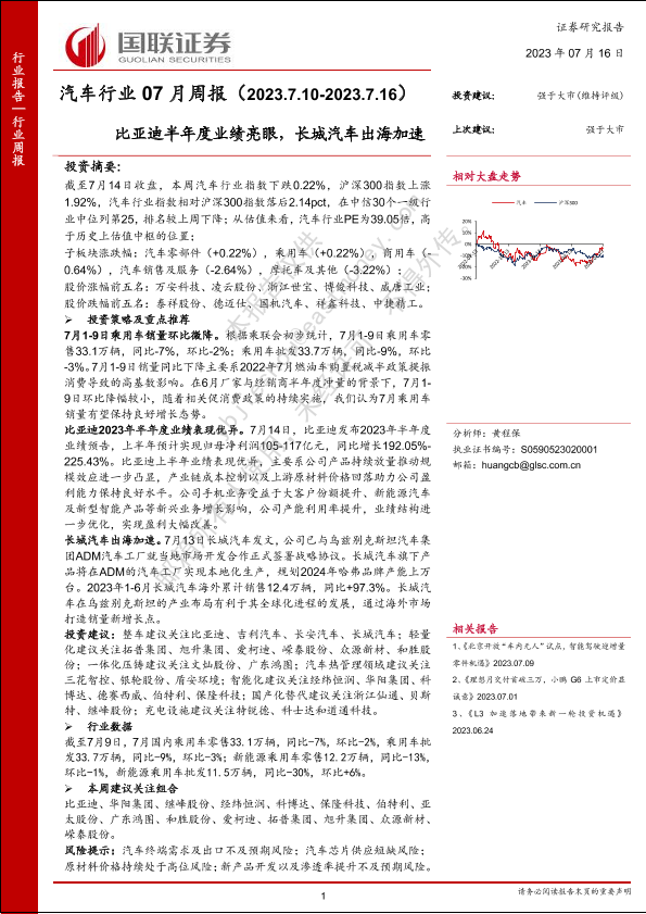 【国联证券】【20230716】汽车行业07月周报:比亚迪半年度业绩亮眼,长城汽车出海加速-23页
