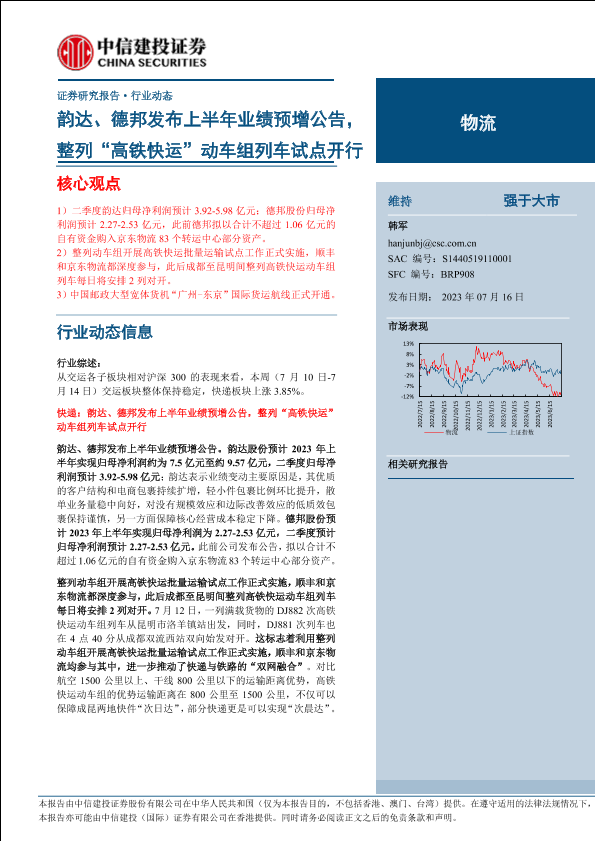 【中信建投证券】【20230716】物流行业:韵达、德邦发布上半年业绩预增公告,整列“高铁快运”动车组列车试点开行-23页