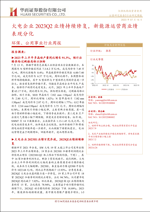 【华西证券】【20230716】环保、公用事业行业周报:火电企业2023Q2业绩持续修复,新能源运营商业绩表现分化-22页