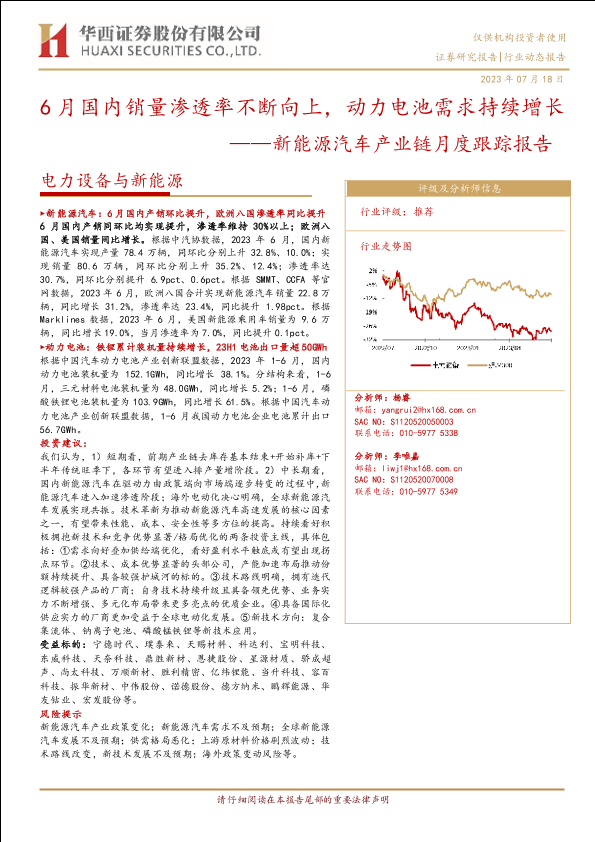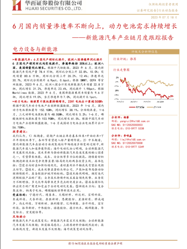 【华西证券】【20230718】电力设备与新能源行业新能源汽车产业链月度跟踪报告:6月国内销量渗透率不断向上,动力电池需求持续增长-15页