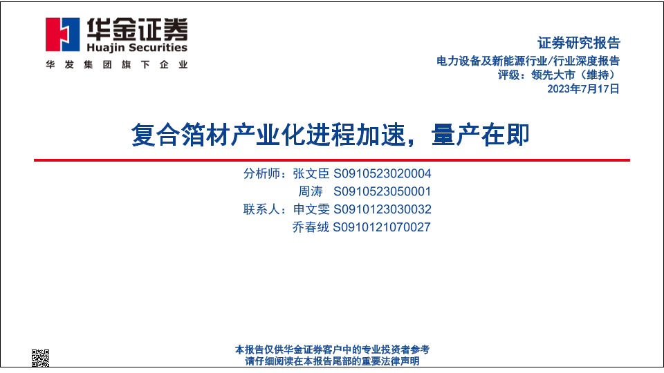 【华金证券】【20230717】电力设备及新能源行业深度报告:复合箔材产业化进程加速,量产在即-46页