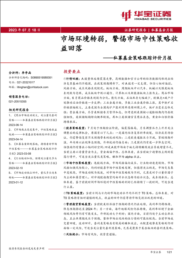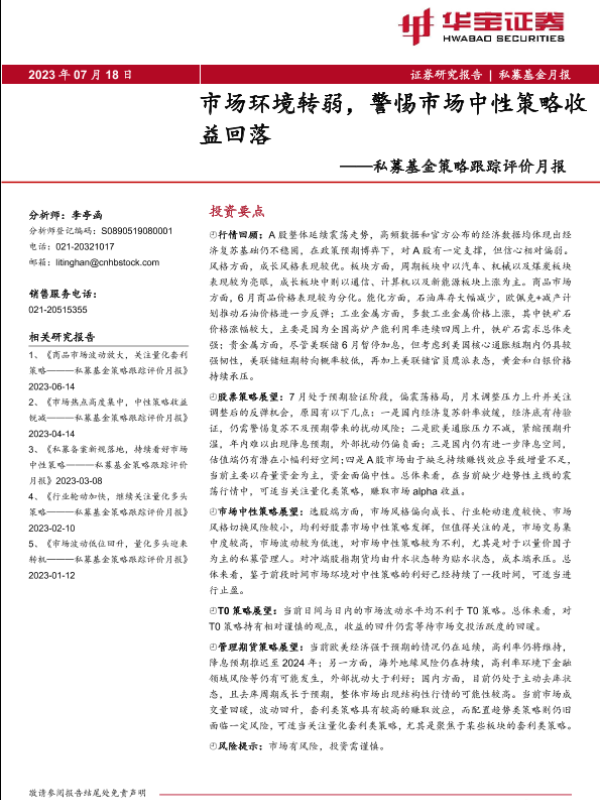【华宝证券】【20230718】私募基金策略跟踪评价月报:市场环境转弱,警惕市场中性策略收益回落-21页