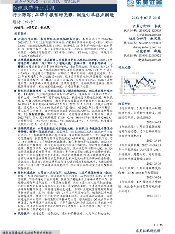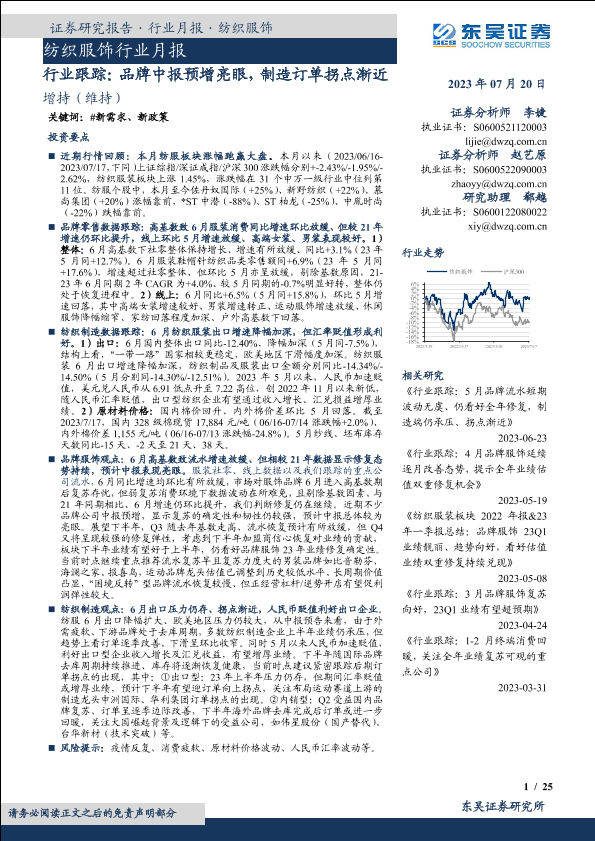 【东吴证券】【20230720】纺织服饰行业月报:行业跟踪:品牌中报预增亮眼,制造订单拐点渐近-25页