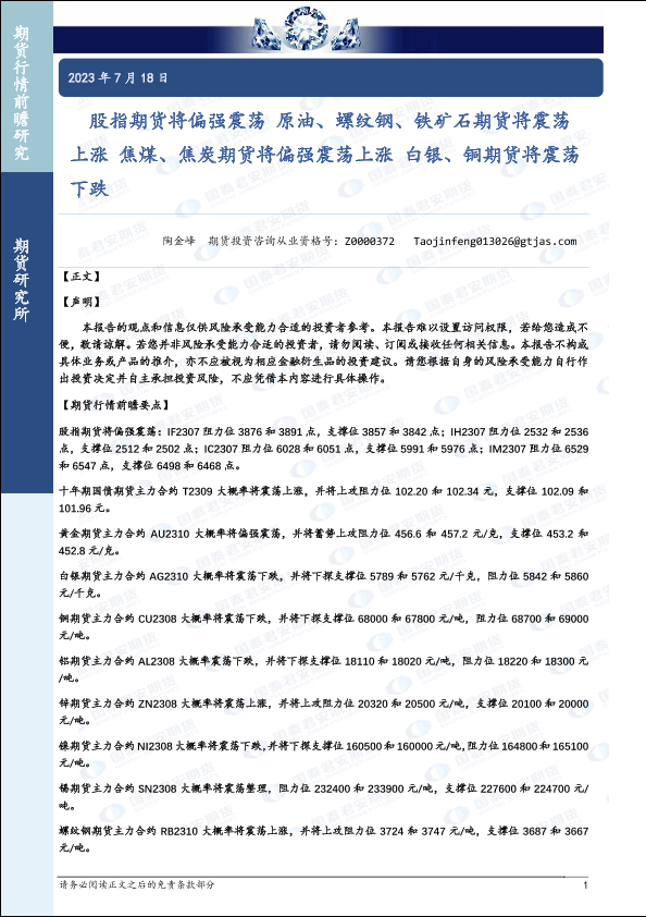 【国泰君安期货】【20230718】股指期货将偏强震荡,原油、螺纹钢、铁矿石期货将震荡上涨,焦煤、焦炭期货将偏强震荡上涨,白银、铜期货将震荡下跌-44页