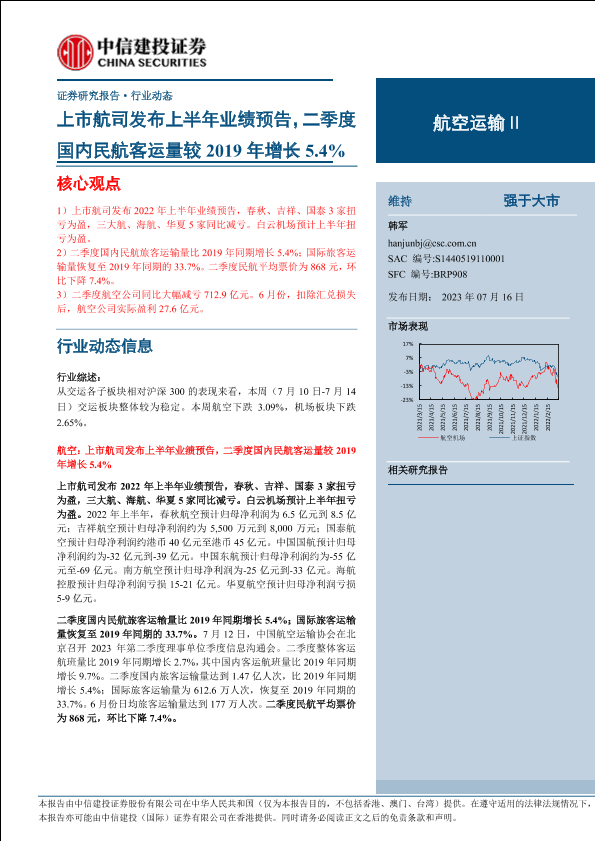 【中信建投证券】【20230716】航空运输行业:上市航司发布上半年业绩预告,二季度国内民航客运量较2019年增长5.4%-25页