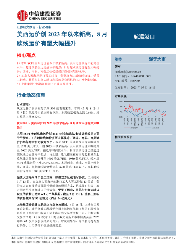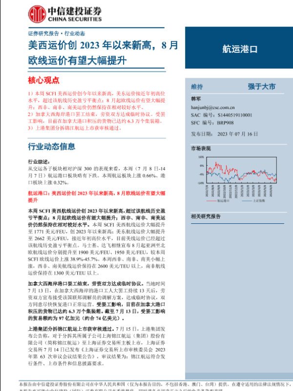 【中信建投证券】【20230716】航运港口行业动态:美西运价创2023年以来新高,8月欧线运价有望大幅提升-26页