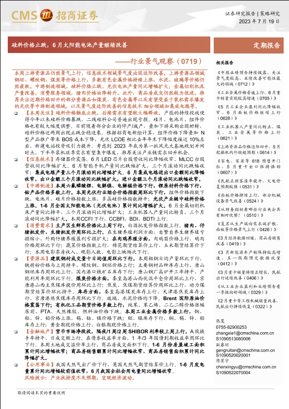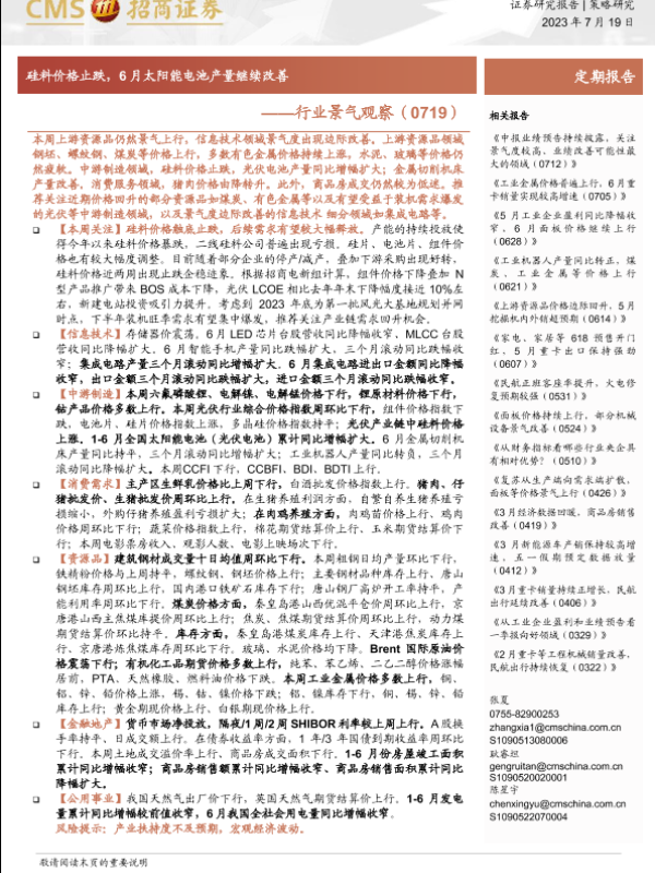 【海通证券】【20230719】行业景气观察(0719):硅料价格止跌,6月太阳能电池产量继续改善-30页