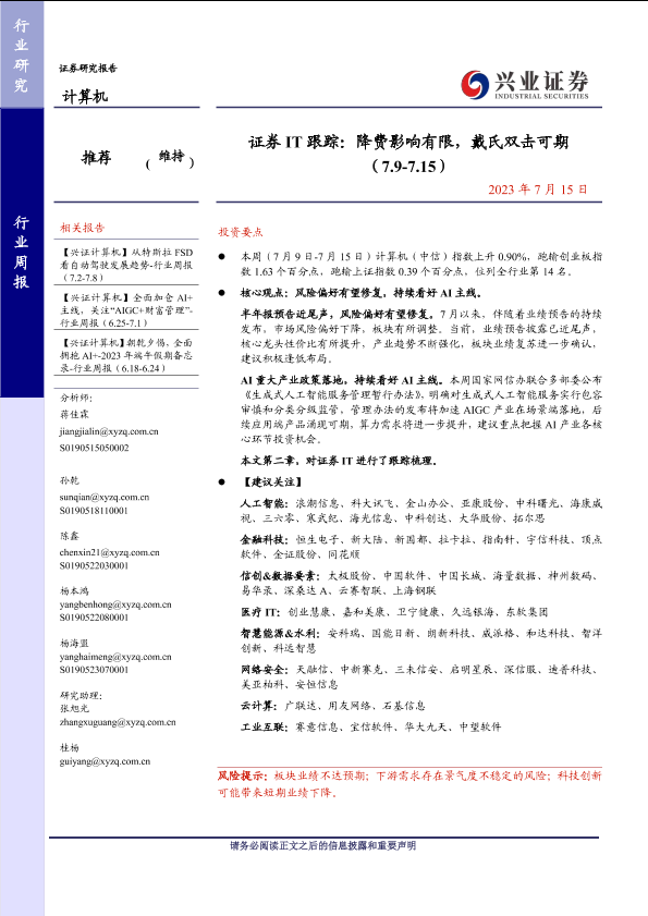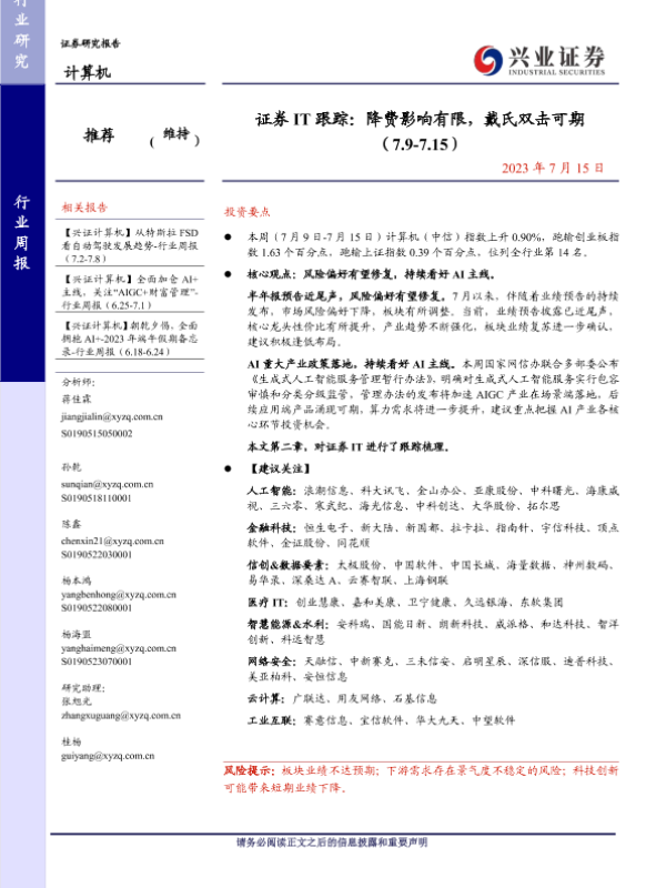 AI技术 计算机行业 证券IT 金融科技 降费影响