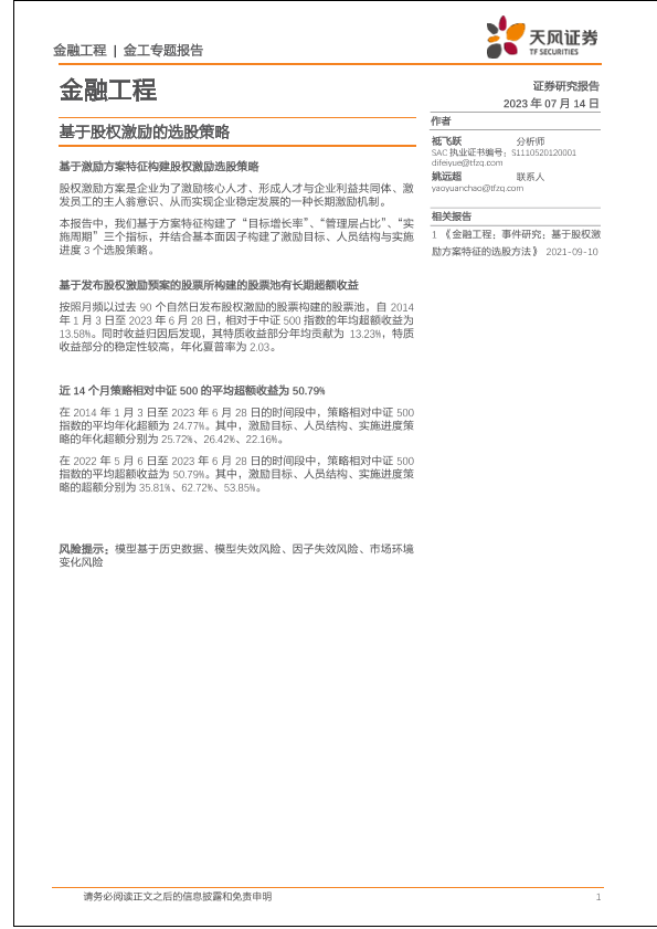 天风证券 股权激励 选股策略 量化分析 金融工程