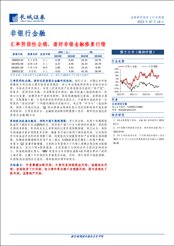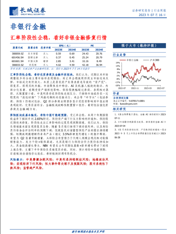 【长城证券】【20230716】非银行金融行业周报:汇率阶段性企稳,看好非银金融修复行情-29页